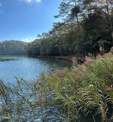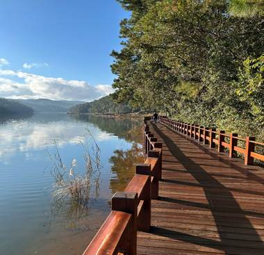 梅子湖公园位于普洱市区,核心景观是一条沿湖一侧延展4公里的步道。游人稀少,空气澄澈。湖面如镜,倒映着蓝天与绿树;步道蜿蜒,引人深入自然怀抱。这里没有喧嚣,只有微风、水声与偶尔掠过的飞鸟,是都市中难得的宁静角落。我们走得比较慢,往返耗时三个多小时,丝毫不觉疲惫。