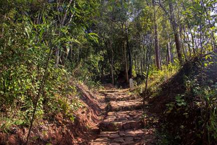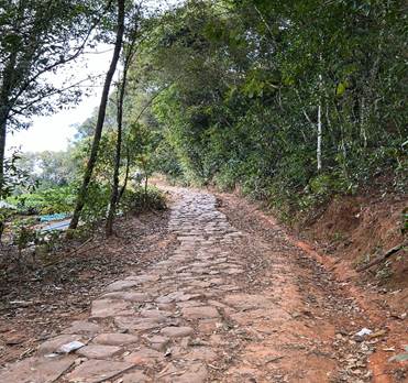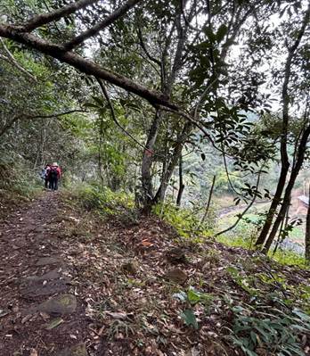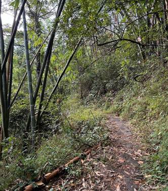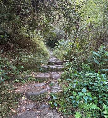 沿着菜园旁的小径步入古道,起初可见几户人家与咖啡馆,但不过几分钟,便彻底进入原始森林。石块铺就的古道起伏平缓,两旁古木参天,鸟鸣幽深。行走其间,既是轻度徒步,亦是身心疗愈的“森林浴”。
