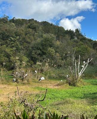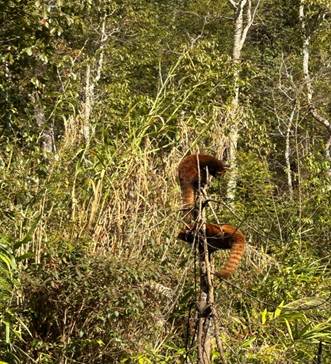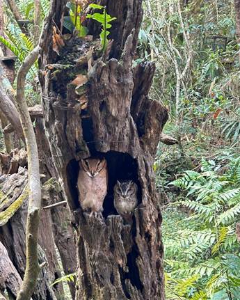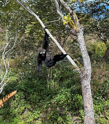 园中还生活着几只长臂猿。除餐厅外那只外,另有一只名叫“玲玲”的稍大个体藏身密林。若你轻唤其名,它竟会探头张望,甚至摇动树枝回应,灵动可爱。此外,树洞中的猫头鹰、枝头休憩的小熊猫、湿地里的白鹭……无不彰显这片森林的生命力。