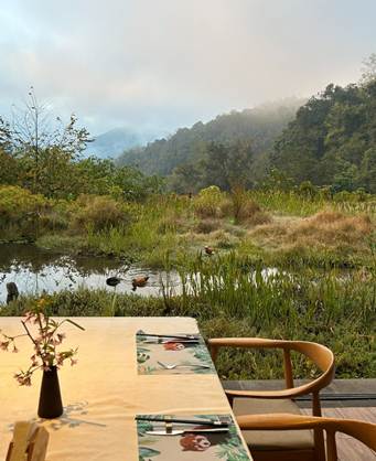 第四天,我们打车去了太阳河森林公园。森林公园离普洱市区大约50多分钟的车程。入住公园里的普洱小熊猫庄园。这座森林酒店规模不大,仅有90余间房,每栋皆为独立别墅。住在里面,那满眼的风景,清芬的空气,以及宁静的环境,都是外面的酒店难以比拟的。特别令人印象深刻的是酒店的湿地公园餐厅。起初我以为湿地公园是虚的,只是为了吸引顾客而用的噱头。但中午到餐厅就餐才发现这是真正的湿地公园餐厅,只是湿地规模不是特别大。坐在餐厅就餐,感觉就是在大自然的美景中就餐。美景的湖中有野鸭(鸳鸯?)和白鹭等飞禽。