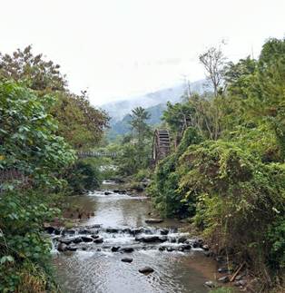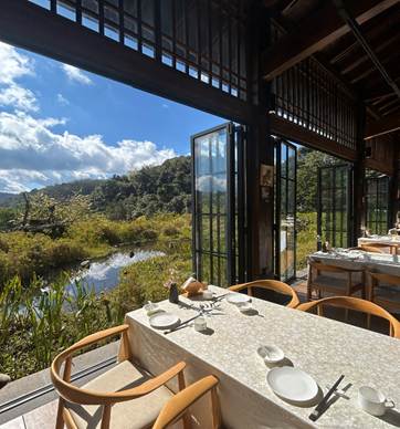 行程第三天,我们来到那柯里古寨。前夜刚下过一场大雨,清晨抵达时,寨外小河被翠绿山峦环抱,栈道旁草木滴翠,空气中弥漫着湿润而清冽的芬芳,令人心旷神怡。