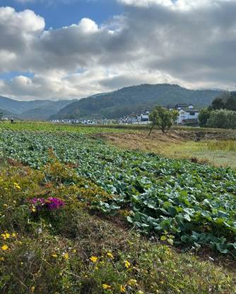 穿过城门,眼前豁然开朗:两侧青山夹道,中间是一片生机盎然的菜园,顿时一股强烈的田园诗画面感涌上心头。